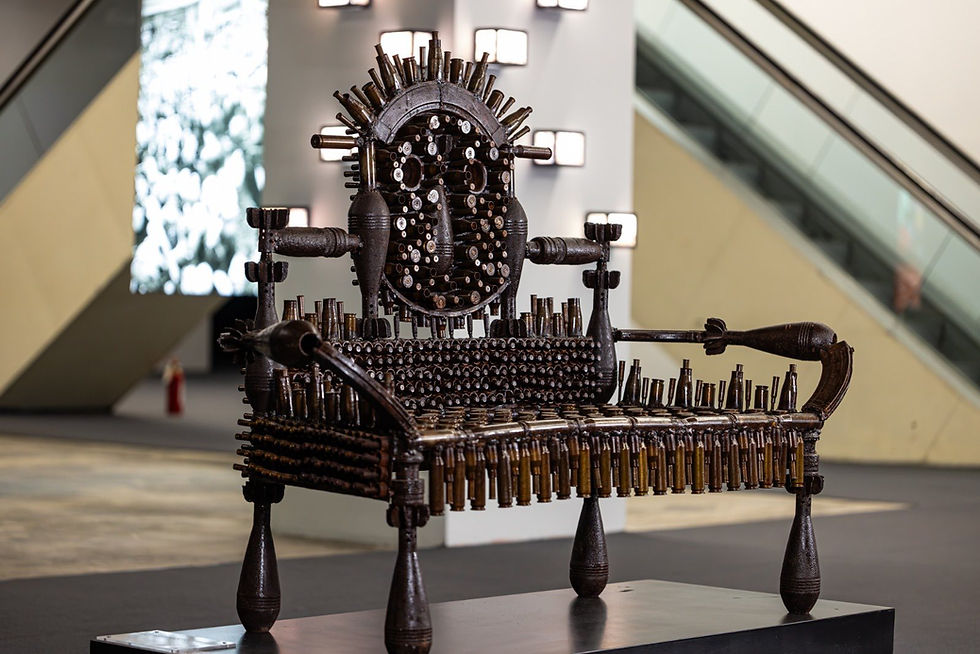 Mabunda repurposes the detritus of conflict—AK-47s, rockets, land mines, and shell casings, for example—turning these destructive objects into stunning masks, furniture, and other sculptures.